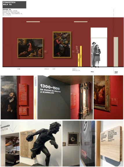La pinacoteca diffonde echi per tutto l’edificio con opere d’arte che si possono scovare anche nell’atrio, nelle sale studio, in biblioteca. Il suo cuore però è il Corridoio del tempo dell’arte: un tempo conduceva gli alunni alle loro aule, oggi ripercorre le tappe dell’arte a Pieve di Cento dal 1300 a oggi. Una linea del tempo chiamata regolo accompagna e introduce alle sale attraverso informazioni gerarchizzate a livelli: secoli, provenienze, contesti, autori, approfondimenti.