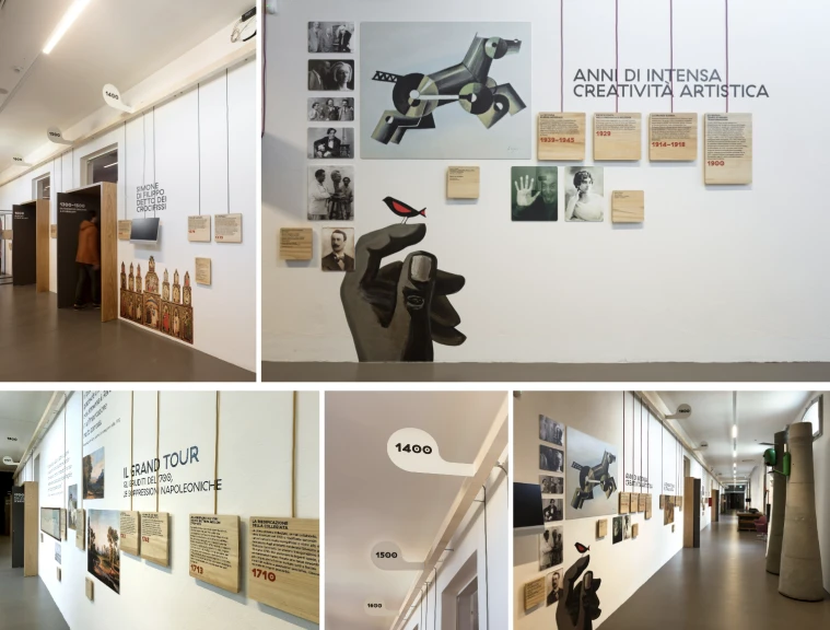 Per aggiungere un’esperienza operativa alla visita, abbiamo proposto di dedicare un livello della linea del tempo alle attività didattiche trasversali a libri e opere d’arte, a biblioteca e pinacoteca. Con un sistema di autoproduzione semplice da gestire, il personale educativo poteva creare percorsi monografici alla base di laboratori e workshop. La parete degli approfondimenti può essere aggiornata dai visitatori: qui è dove Le Scuole si fanno esperienza attiva e diretta.