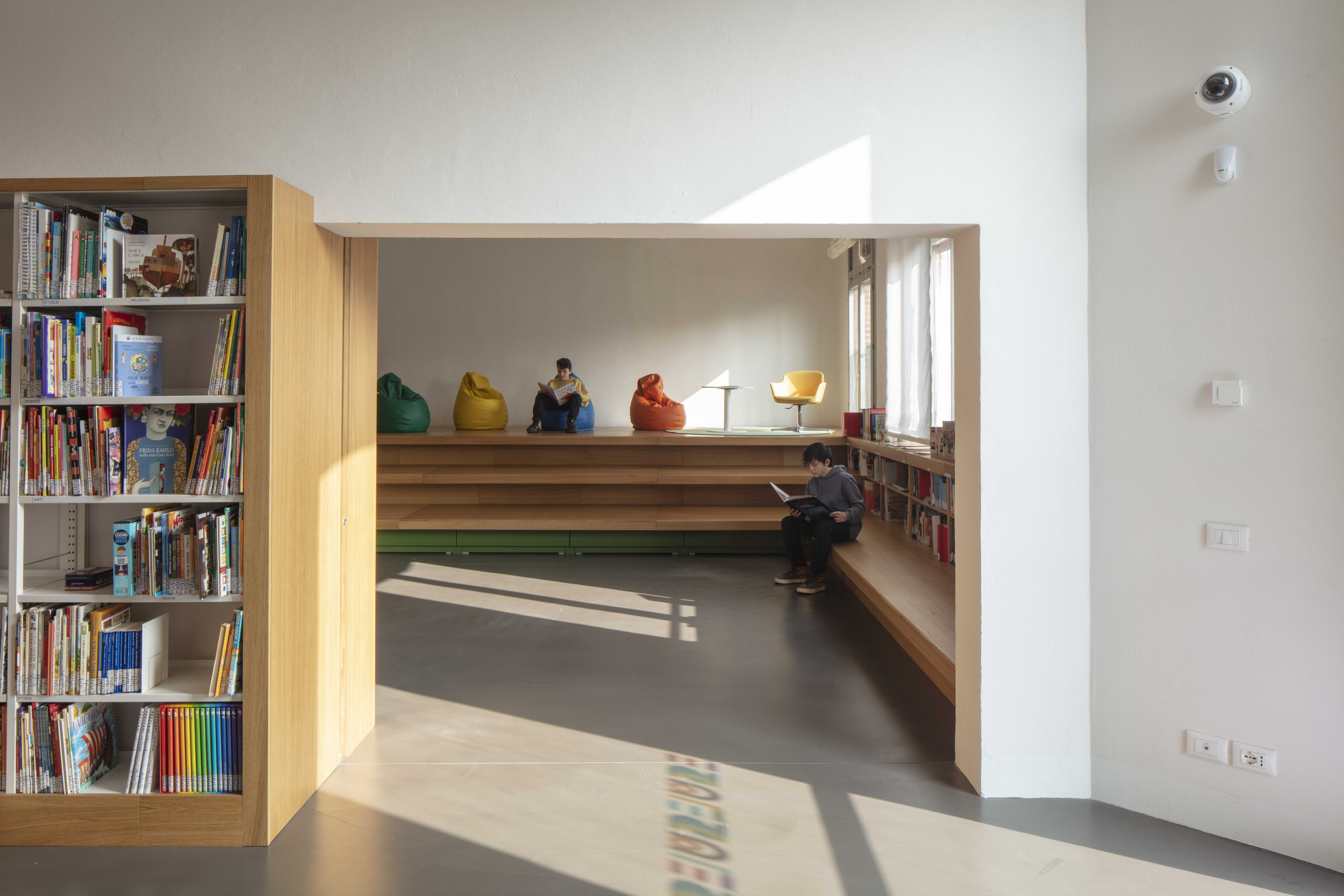 Include aree adulti e bambini, aule studio e lettura. L’orientamento a scaffale traduce la classificazione Dewey in tre livelli gerarchici semplici da consultare: macro area, tema, autore.