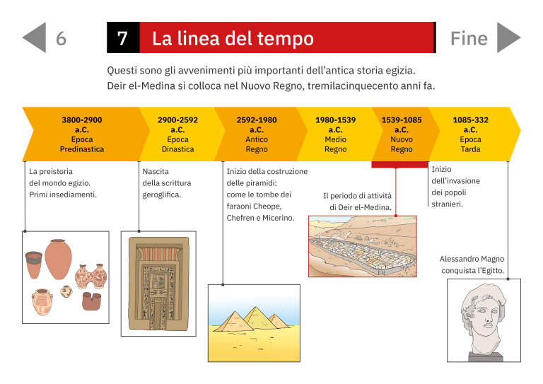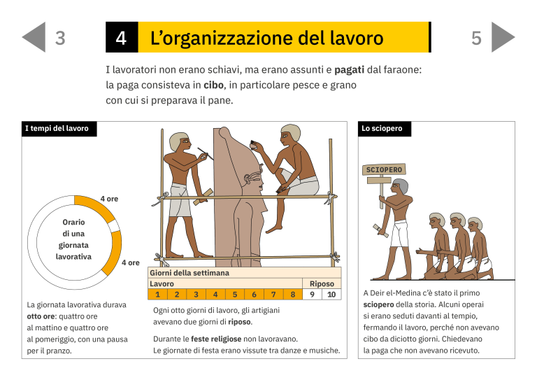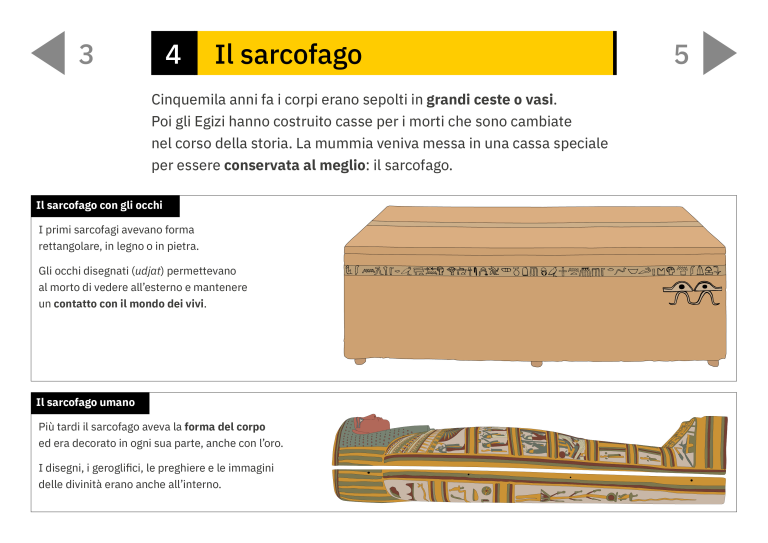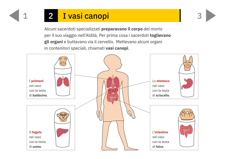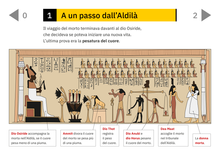 Per il Museo Egizio di Torino e con la Fondazione Paideia abbiamo affrontato la sfida di raccontare, a persone con bisogni comunicativi speciali, la vita degli antichi egizi. Ostruzione di progetto: utilizzo individuale e in gruppo, diffusione cartacea e digitale, fruizione autoconsistente e senza rimandi. Nella messa in pagina abbiamo mantenuto salda la linearità del racconto: no menù, no link; adottato due soli schemi compositivi nel rapporto testo immagine, ridotto al minimo i codici visivi delle illustrazioni e gli stili tipografici del testo.