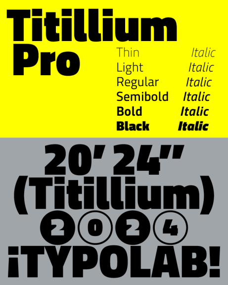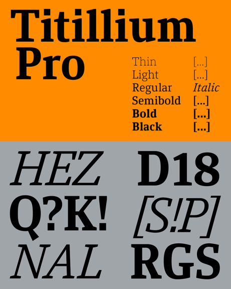 Abbiamo rilasciato con licenza Open Font License (OFL) una versione ampliata del Titillium. Lo abbiamo fatto dopo anni di utilizzo serrato annotando desideri e criticità. Lo abbiamo fatto con il consenso dell’Accademia di Urbino e dei designer Marcello Signorile e Luciano Perondi che lo hanno progettato e sviluppato con gli studenti dei loro corsi. Lo abbiamo chiamato Titillium PRO e a breve contiamo di rilasciare, sempre sotto licenza OFL, la versione serif!