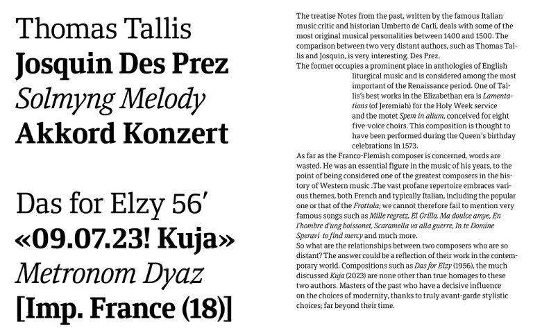 L’intenzione è di sviluppare parallelamente anche una seconda versione in discontinuità con il sans e con caratteristiche più vicine ai canoni storici dei serif. Tracciamo così un doppio percorso progettuale con lo scopo di soddisfare diverse esigenze editoriali, senza mai perdere l’identità della famiglia Titillium e le sue metriche verticali.