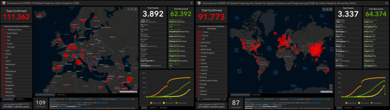 The Johns Hopkins University (JHU) dashboard seems to have become one of the most popular tools for tracing COVID-19 through time and space. Referenced by journalists and scientists, at a certain point, the map even began to appear in official government meetings in Germany, Italy, Israel and probably many other countries too. This use in a political context becomes particularly interesting if we consider the website’s official disclaimer: “Questo sito web e i suoi contenuti, inclusi tutti i dati, la mappatura e l'analisi ("Sito"), copyright 2020 Johns Hopkins University, tutti i diritti riservati, sono forniti al pubblico esclusivamente per scopi educativi e di ricerca accademica. [...] Il sito web si basa su dati disponibili al pubblico provenienti da diverse fonti, che non sempre sono d'accordo. Con il presente documento la Johns Hopkins University declina ogni e qualsiasi dichiarazione e garanzia in relazione al Sito Web, incluse l'accuratezza, l'idoneità all'uso e la commerciabilità. È severamente vietato fare affidamento sul Sito Web per una guida medica o per l'utilizzo del Sito Web in commercio.”