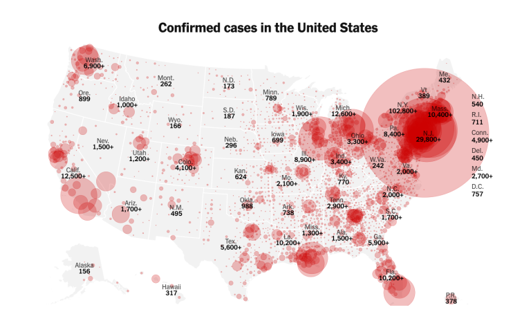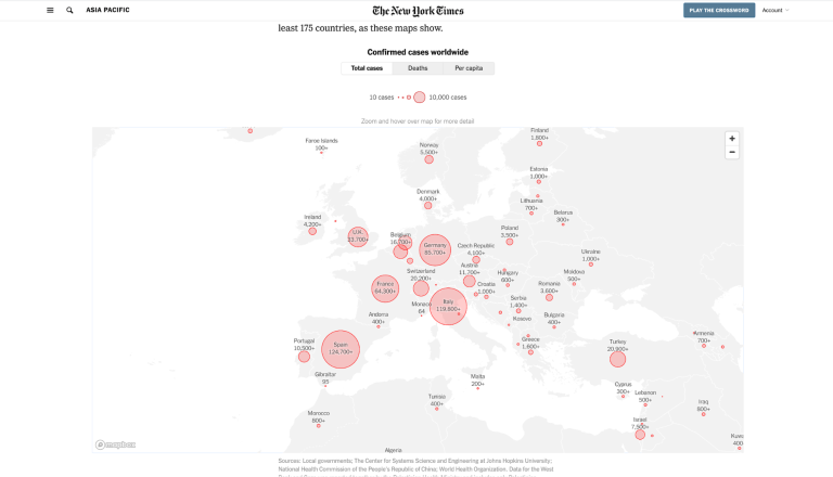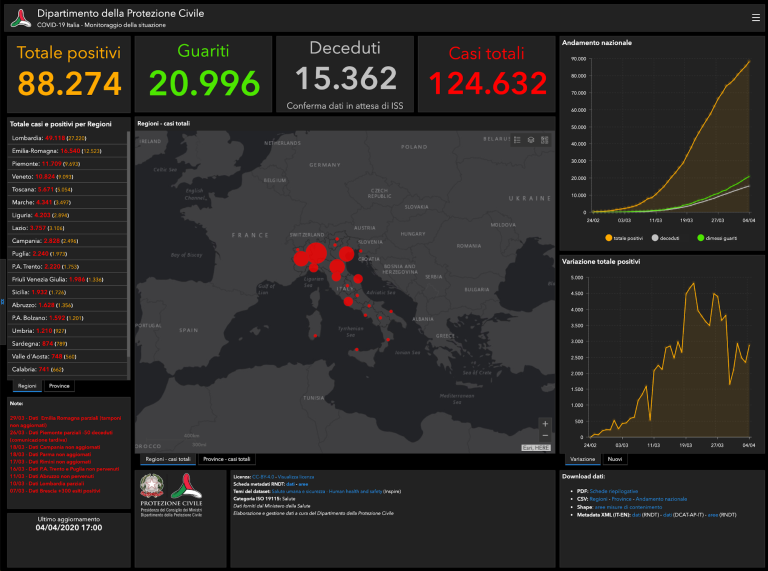 The JHU dashboard is not an aberration and many countries have reproduced it to represent the data collected on a national scale. This type of visualisation, which has become to all effects a standard, is only altered in its surface aspects in order to visually dramatize the data to a greater or lesser extent.