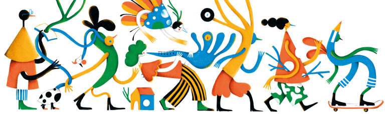 The visual identity of this year’s fair emerged from a workshop that for the first time ever was held completely online. Staggered time zone video calls, shared whiteboard exchanges, notes and comments on digital files and continuous revisions were the unusual backdrop to our conversation with Sólin Sekkur. Diluted in numerous small meetings and exchanges, the journey undertaken with the Mexican illustrator selected, generated from originally dark and cloudy atmospheres, a brightly coloured parade of people eager to celebrate the return to physical locations. A big party is also the inspiration for the title of the edition: Children’s Content rocks! Join the party.