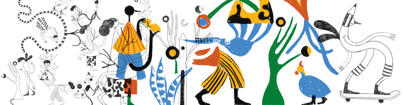 BCBF 2024 comes to an end. A short rest, then immediately a retrospective to define the mood of the upcoming 2025 edition: we’re aiming for color, movement, invention, action… We’re now waiting for submissions to the Illustrators Exhibition, from which we’ll choose who will take part in the VIWS and illustrate the 2025 edition. Our attention is drawn to four boards that perfectly match what we were looking for: the colors, the fluidity of the shapes, the motion of the drawing. The characters on display express gambiarra, the Brazilian art of devising solutions with scarce means and rich imagination. The artist is Bruno de Almeida (Brazilian, 29 years old). The choice is made. In June, he is in Bologna, and we welcome him to the Visual Identity Workshop. Amid conversations, sketches, and clippings, the cosmo-composition is born: a system in which everyone is connected. They dance to the rhythm of Shape, Share and Shout Children’s Content: an explicit invitation to share the contagious, cosmopolitan energy that flows through exhibitions, stands, meetings, events, illustrations, books, games…