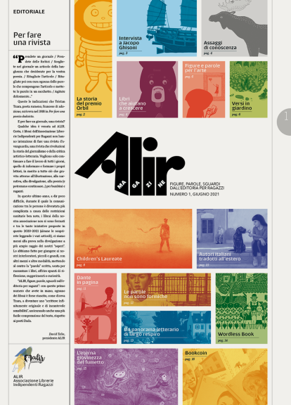 ALIR è il magazine della Associazione Librerie Indipendenti per Ragazzi. Lo abbiamo progettato e impaginato nei centimentri e nella tipologia di lettura, con il format tabloid. Scorrevole, fluido, ampiamente illustrato.
