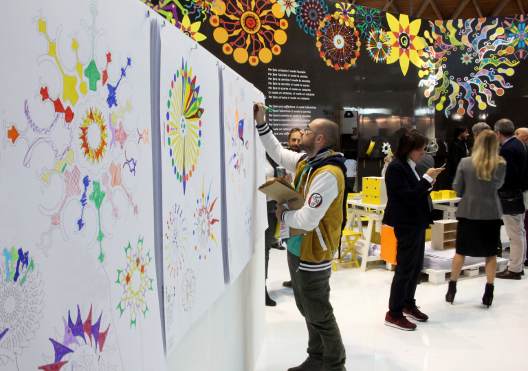 Un allestimento in cui il visitatore diventa il protagonista delle infinite trasformazioni dei metalli. Il pubblico si mette in gioco, colorando sulle pareti dello stand grandi e coloratissimi fiori basati sulle forme dei rottami. È così che lo stand si anima, diventando galleria d’arte di forme e colori in continua trasformazione.