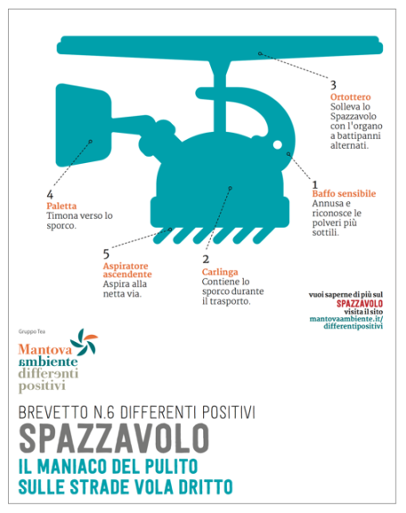 L’asse portante del progetto è rappresentato dai 12 Fantastici Brevetti. Invenzioni fantastiche che illustrano i servizi, i valori e le aspirazioni più profonde di Mantova Ambiente, raccontandole con ironia e positività. Presentati con cadenza regolare, i Fantastici Brevetti hanno accompagnato due anni di comunicazione e sono stati parte integrante del progetto MAME Mantova AMbiente Educazione.