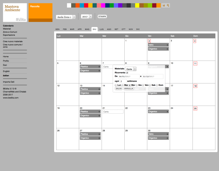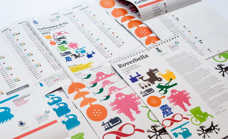 I calendari della raccolta porta a porta sono lo strumento principale con cui Mantova Ambiente informa i cittadini. Per la nuova edizione abbiamo previsto una sostanziale revisione dei contenuti, del linguaggio, della grafica e dello stesso sistema di produzione editoriale. I calendari 2017 sono stati prodotti da un team misto: Chialab e Mantova Ambiente hanno lavorato in stretta collaborazione a partire da un modulo dedicato di BEdita CMS.